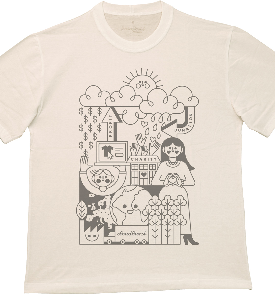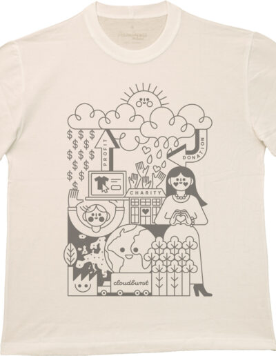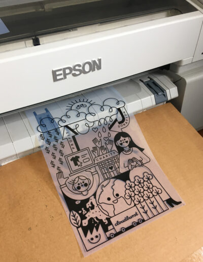 fehér + 4 színes haftone szitanyomás melirszürke pólóra. A nyomás a póló összevarrása előtt lett nyomtatva.